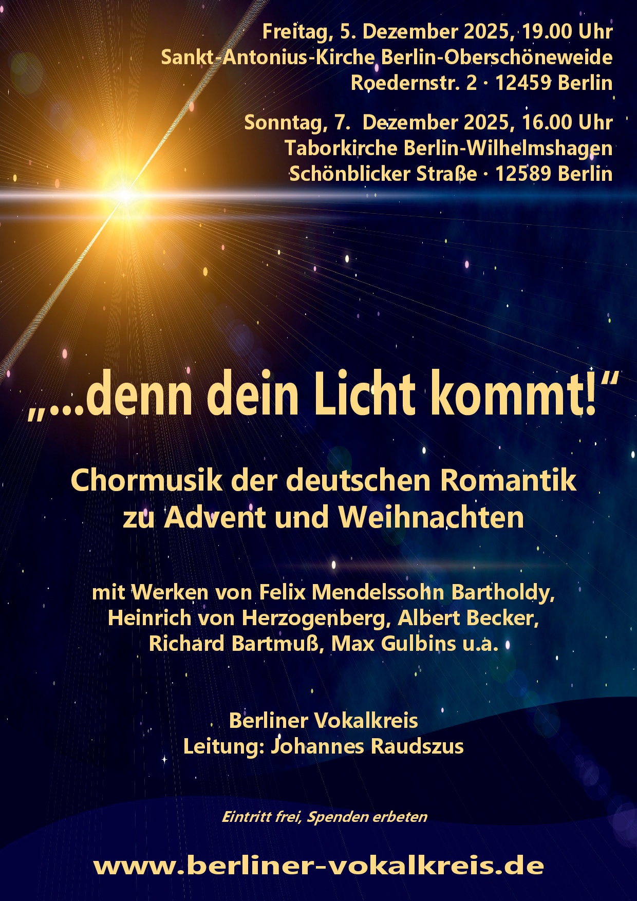 Das diesjährige Weihnachtsprogramm des Berliner Vokalkreises widmet sich der festlichen Chormusik der deutschen Romantik für Advent und Weihnachten. Die Epoche der Romantik, die im 19. Jahrhundert zur Blüte gelangte, brachte eine Fülle geistlicher Chormusik hervor, die bis heute durch ihren warmen Klang, ihre Ausdruckskraft und ihre innige Verbindung von Text und Musik berührt. Im Zentrum stehen Werke, die das adventliche Warten, die Verheißung des kommenden Lichts und die Freude über die Geburt Christi zum Klingen bringen.
