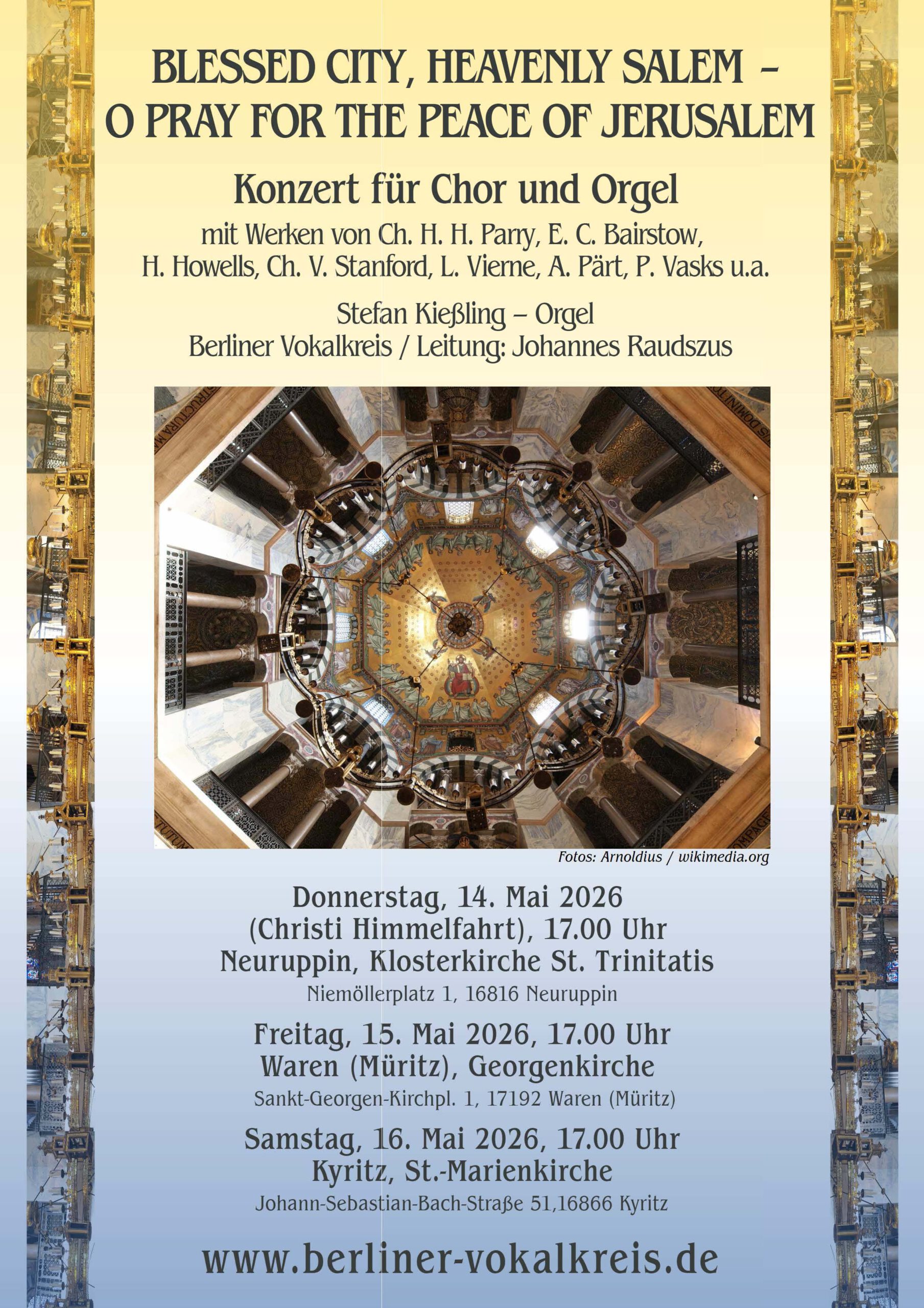 Der Konzerttitel – Blessed City, Heavenly Salem – O Pray for the Peace of Jerusalem – verweist auf zwei biblische Städte, zwei spirituelle Räume: das irdische Jerusalem, das Zentrum religiöser Hoffnung, aber auch politischer Spannungen, und das himmlische Jerusalem, das in der christlichen Tradition als Ort vollendeter Gemeinschaft mit Gott verstanden wird. Dazwischen steht der Mensch – fragend, hoffend, betend.